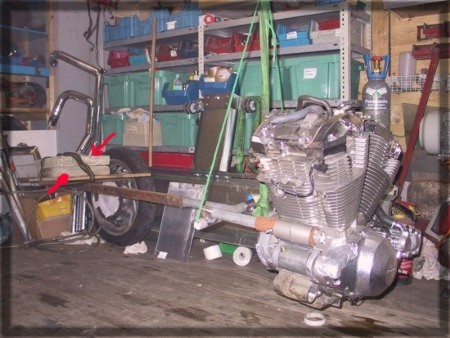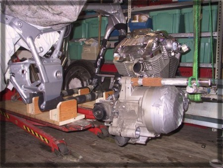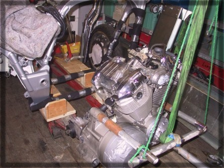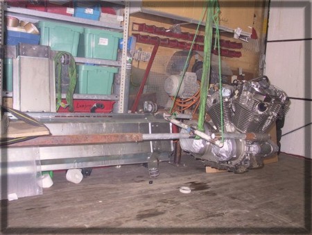 und der Motor hängt im Elektrokran an der Hilfsvorrichtung.